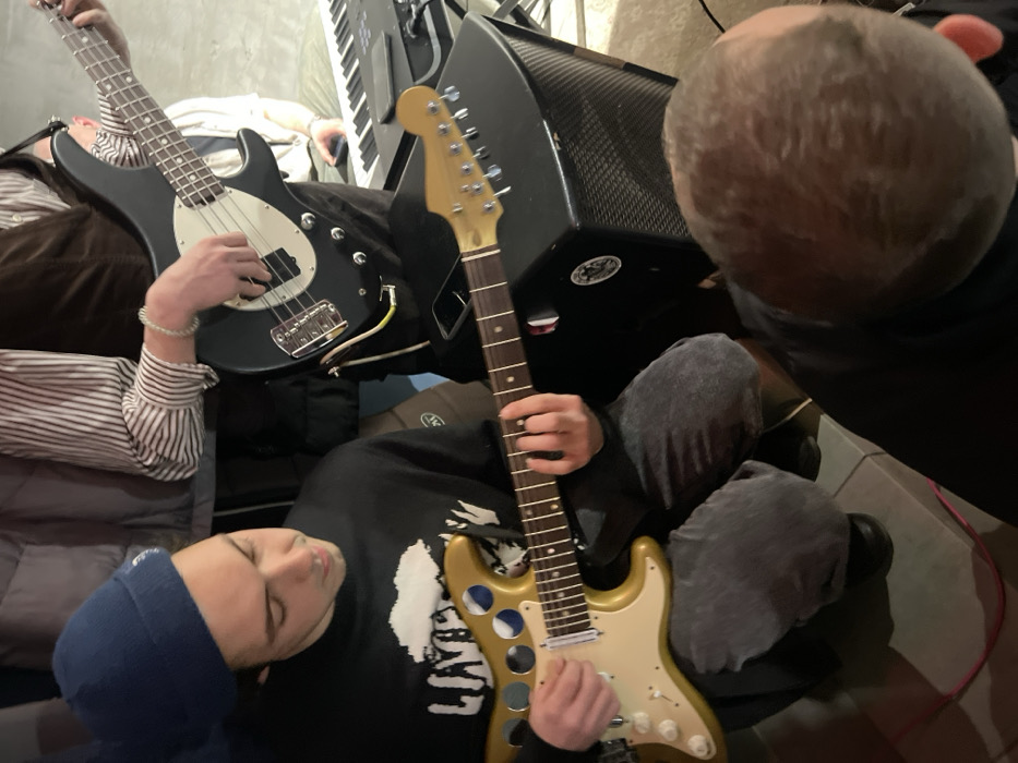The image depicts an indoor scene in Ovoshchnoy, Russia, featuring three visible individuals and musical instruments