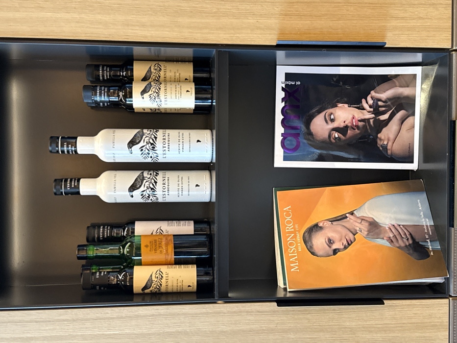The image displays a two-tiered black shelving unit with light wood-veneered side panels, located in a commercial establishment at Av. Meritxell, 97, les Escaldes, Andorra, as indicated by text on a displayed magazine. The upper shelf holds seven bottles. From left to right: one amber-labeled bottle of "L'ESTORNELL" extra virgin olive oil, one green bottle of "VINAGRE DE JEREZ," and one dark-labeled "L'ESTORNELL" bottle are grouped on the left. In the center, two identical white bottles of "FAMILIA YRA L'ESTORNELL ARBEQUINA" extra virgin olive oil feature a black crow on an olive branch motif. On the right, two dark-labeled "L'ESTORNELL" extra virgin olive oil bottles, also depicting the crow and olive branch, complete the display. All bottles have black caps. The lower shelf exhibits two magazines. The left magazine, "MAISON ROCA," has an orange cover featuring a light-skinned woman with slicked-back blonde hair, wearing a white garment. She looks directly forward, with her left hand raised, fingers slightly curled, and the middle finger subtly extended. The right magazine, "amx at maxim," displays a dark-haired, light-skinned woman looking upward and to the right, with her right hand near her mouth and her left hand across her chest, adorned with rings.