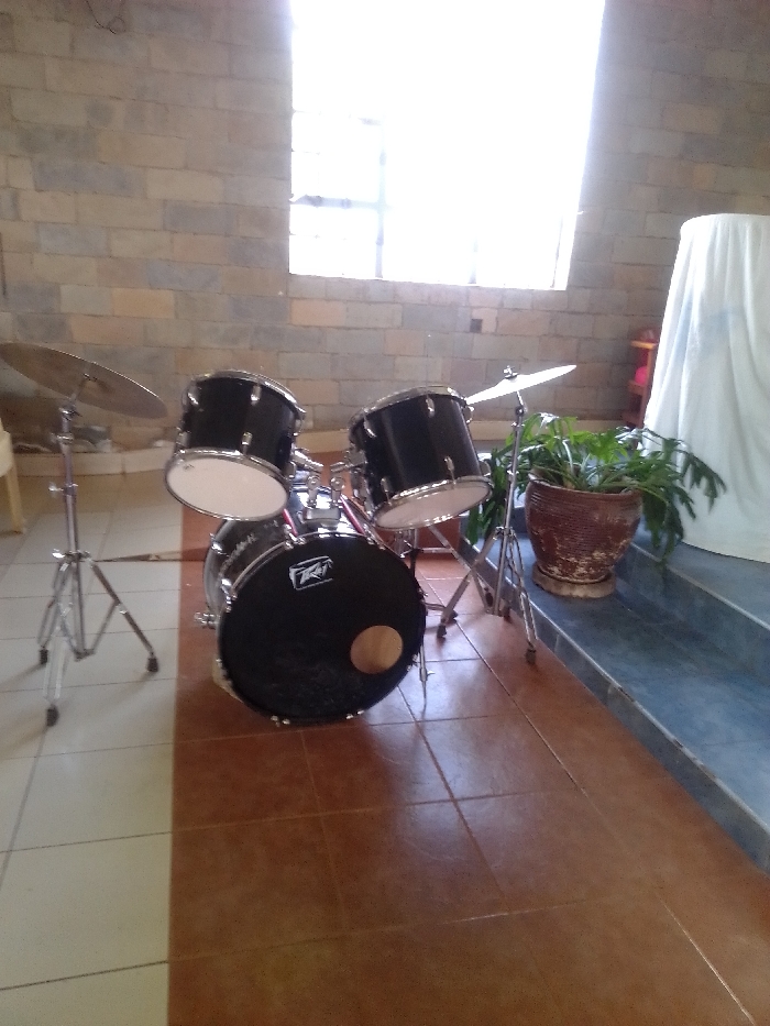 An indoor scene in Ndeiya, Kenya, displays a black drum set positioned on a tiled floor