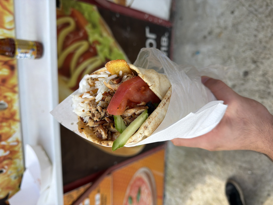 - "A person's right hand holds a large, partially wrapped kebab or gyro in a pita flatbread, filled with seasoned meat, white rice, sliced red tomatoes, sliced green cucumbers, and fried potato pieces" by FM-R01Al2, licensed under CC BY 4.0