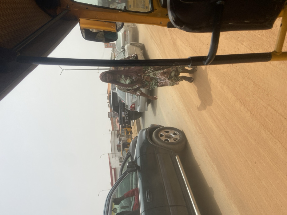 The image displays a daytime street scene captured from the interior of a yellow auto-rickshaw, identified by its right-side frame and mirror. The location is an unpaved, reddish-brown street within a commercial district of the city of Unknown, Unknown, under a hazy, bright sky. A female pedestrian, wearing a patterned long dress in green, brown, and white tones with a maroon head covering, walks towards the right side of the frame, moving across the dusty road. Her left arm is slightly extended, and her distinct shadow is visible on the ground beside her. Vehicular traffic occupies the street. On the left, a dark-colored SUV, likely green or black, is present, with a person's red-sleeved arm and clenched fist extending from its driver's side window. Behind the SUV, a black pickup truck with "TOYOTA" visible on its tailgate is in traffic. Further back, two silver sedans are observed. Multiple yellow auto-rickshaws are visible in the distant background. Low-rise commercial buildings with light-colored facades line the street in the background. A street light pole is situated on the left side of the road. The unpaved road surface exhibits tire tracks and accumulated dust.
