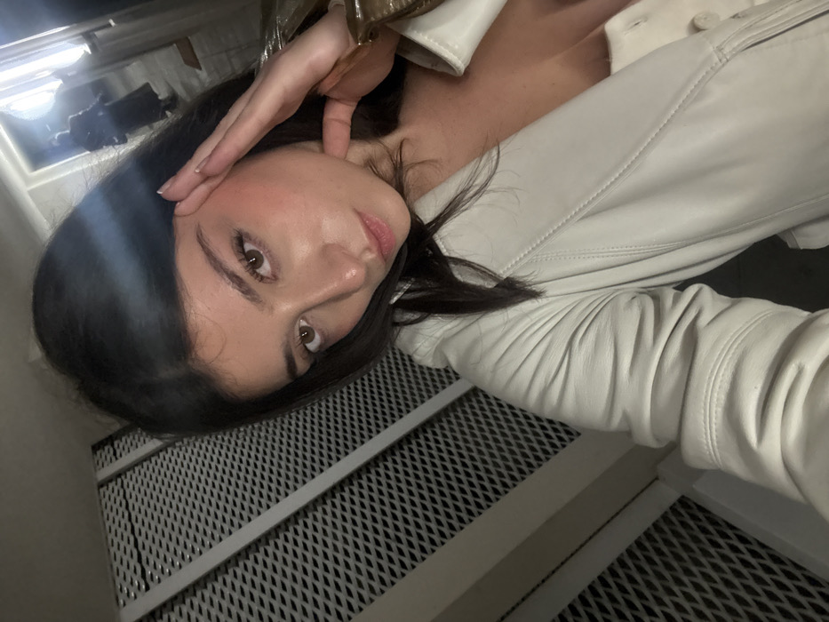 A woman with dark hair poses in a selfie. Her hand is near her face. She is wearing a light-colored leather jacket. The background features a metal grate and a dimly lit hallway. The image is rotated, presenting an unusual perspective.