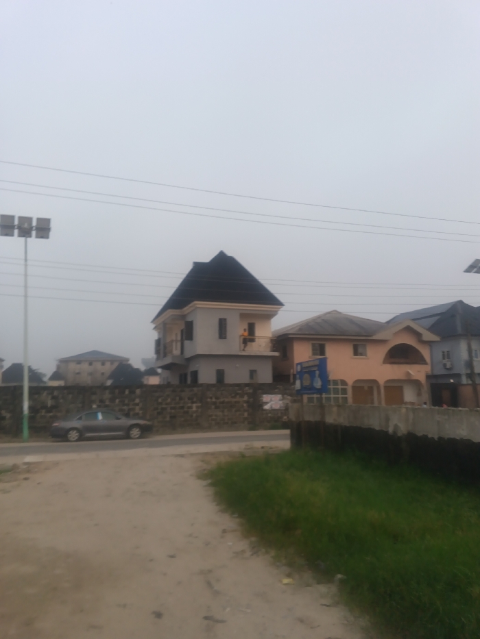 A hazy day scene features a sandy road leading to a row of houses. A gray car is parked near a dark brick wall in front of a two-story house with a dark roof. Adjacent to it is a peach-colored house with an arched window detail and a sign in front. Grass grows along the edge of the road, and utility lines stretch across the sky. A tall pole with multiple lights stands on the left.