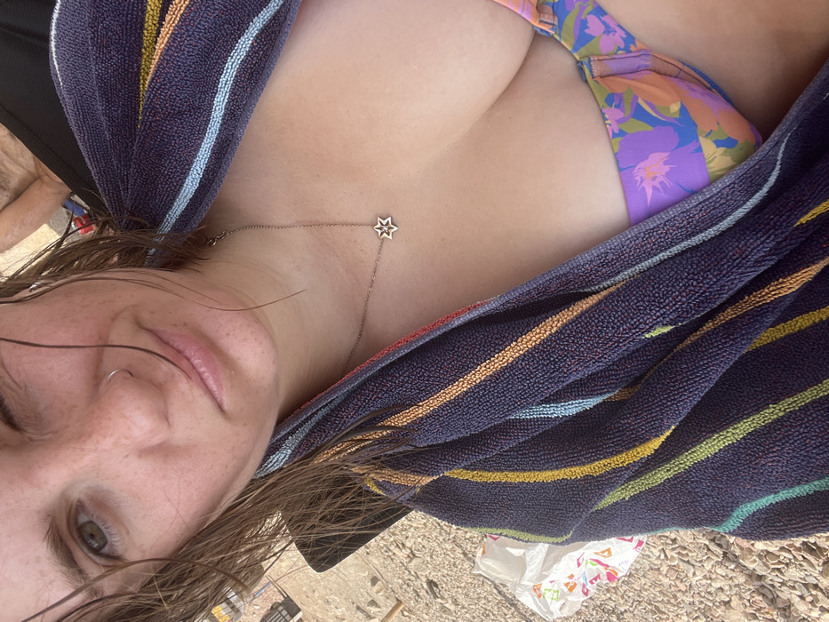 The image presents a close-up, self-portrait style photograph of a young adult female on a pebbled beach or shoreline in Eilat, Israel. The subject has fair skin with visible freckles, wet brown hair, and a small silver nose ring. Her left eye, which is green, is open and directed towards the viewer, while her right eye is closed in a wink. A slight smirk is present on her lips. She wears a delicate silver-colored necklace featuring a Star of David pendant with a small clear stone. A dark blue towel with vertical stripes in yellow, orange, red, green, and light blue is draped over her shoulders and chest, partially obscuring a colorful floral-patterned bikini top, which is predominantly purple, orange, blue, and green. In the blurred background, small, light-colored pebbles cover the ground. A crumpled white plastic item rests on the ground to the lower left. Partially visible in the upper right background is a dark-colored object, possibly a beach chair, and a blurred limb belonging to another individual. The scene is illuminated by natural daylight.