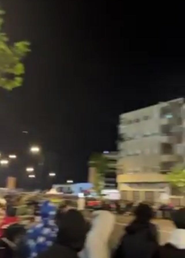 At night, a large crowd of people are gathered on a street. There are streetlights illuminating the area, and buildings can be seen in the background. The people are mostly dressed in dark clothing, and some are wearing hoods or headscarves. There are also some trees and shrubbery present. The camera moves around, showing different parts of the crowd and the surroundings. It is difficult to determine the exact nature of the gathering based on the video alone.