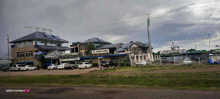 Leadway Hotel and Standard Motors are featured under a cloudy sky. A two-story building houses Leadway Hotel, adorned with solar panels on its roof. Several parked vehicles are in front of it. Adjacent, Standard Motors has a fenced area with what appear to be several vehicles inside. Power lines stretch across the sky. The foreground has vegetation, likely along a roadside. The inscription "police komba" with heart emojis is visible in the bottom left.