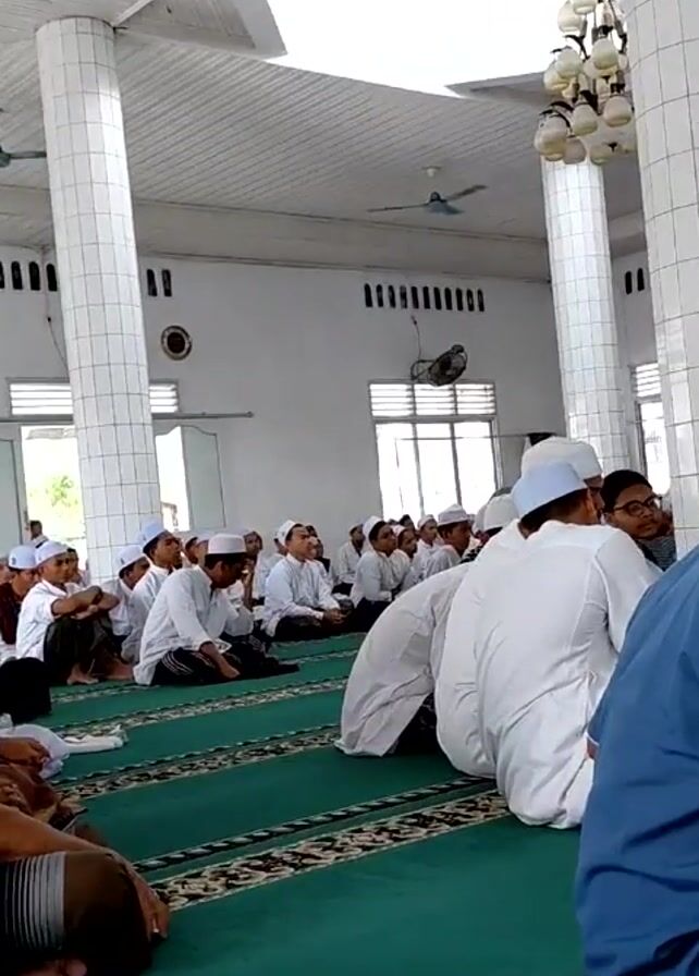 large room, possibly a mosque, filled with men sitting on a green carpet. Most of the men are wearing white shirts and white caps. The room is bright, with light coming in through windows and a skylight. White tiled columns support the ceiling. Ceiling fans are visible. A chandelier hangs from the ceiling. One man in the foreground is wearing a blue shirt. The men are sitting in rows, listening to someone speaking.