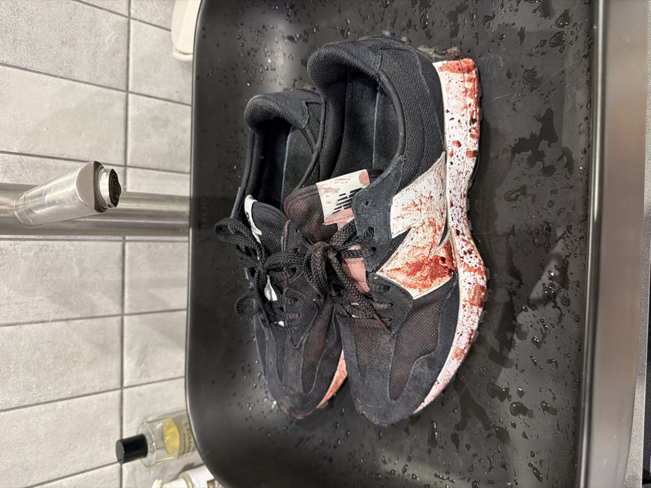 - "A pair of black New Balance 327 athletic shoes, heavily stained with a red, viscous substance consistent with blood, are positioned inside a wet, dark-colored rectangular sink or basin" by FM-pez9w2, licensed under CC BY 4.0