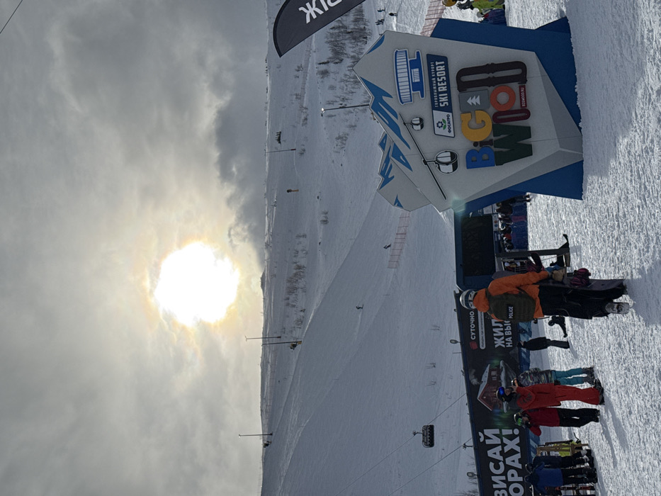 The image depicts the "Big Wood Ski Resort" in Kirovsk, Russia, on a snowy day