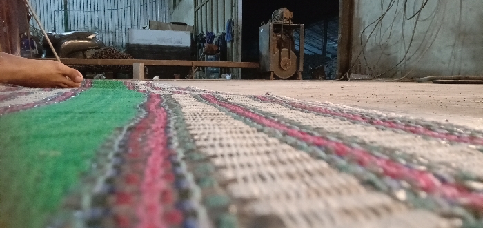 The image depicts an indoor industrial-style environment, captured from a low-angle perspective in the city of Sumput, Indonesia. A multi-colored woven mat, featuring prominent green, white, and red stripes, occupies the foreground, resting on a light gray concrete floor. To the left of the mat, a bare human left foot is positioned on the concrete, with a thin, light-colored rod held between its first two toes, extending forward. In the midground, on the right side of the concrete floor, an aged industrial machine, likely a motor or pump with exposed belts and gears, stands. A dark wooden bench is positioned horizontally behind the mat. The background presents a dimly lit interior featuring a wall constructed from vertical slats on the left, an open doorway with hanging items in the center, and a plain, light-colored wall with multiple dark cables hanging vertically on the right.