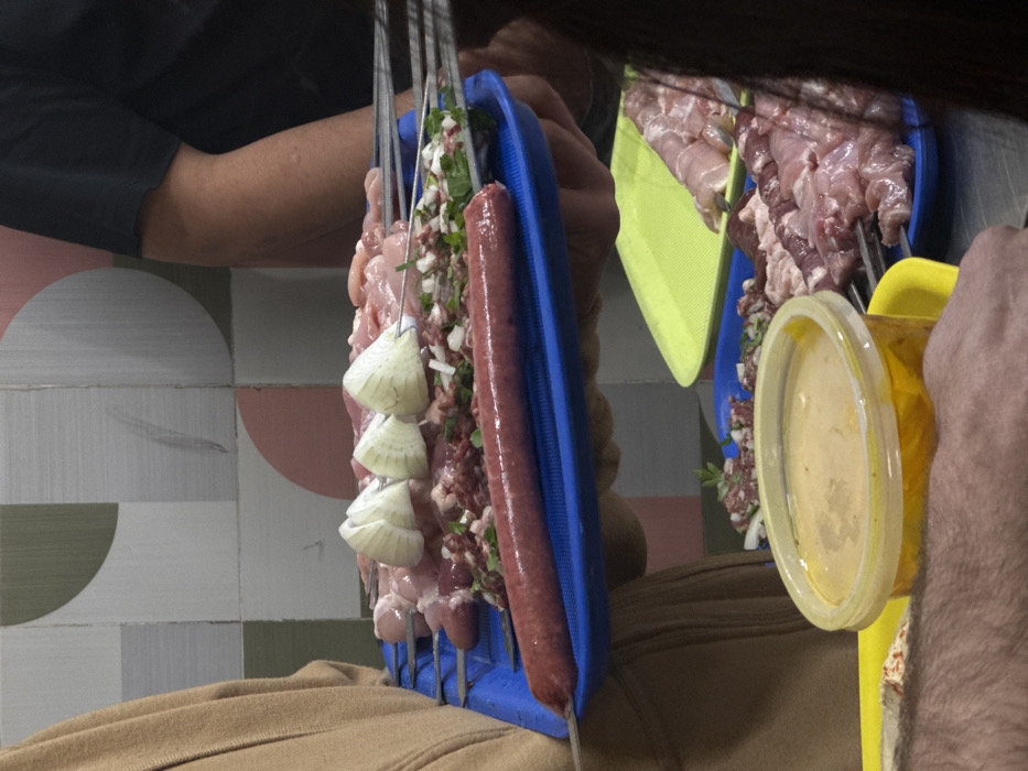 The image portrays a food preparation scene in Azor, Israel, featuring raw meats arranged on skewers for grilling