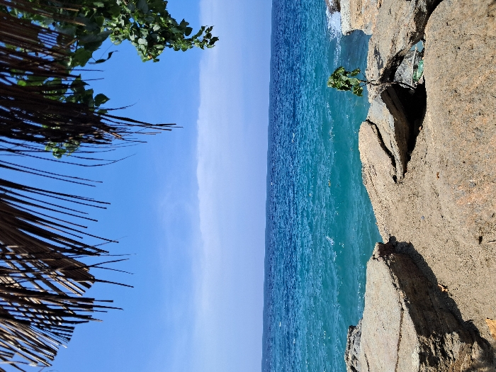 The scene displays a tropical coast. Blue skies meet turquoise water. On the left, fronds and foliage frame the view. Rough, rocky cliffs form the right edge. A small tree clings to the cliffside. The colors are bright, indicating a sunny day.