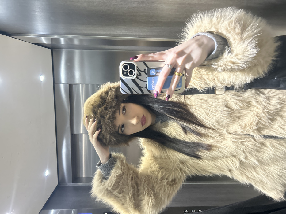 A woman poses in a mirror selfie, wearing a brown fur hat and a tan, fluffy coat with dark trim. Her long, dark hair falls over her shoulders. She holds a smartphone with a zebra-print case adorned with a light blue card holder. Rings adorn her fingers and her nails are painted a dark color with sparkles. The background appears to be the interior of an elevator with stainless steel walls and ceiling lights.