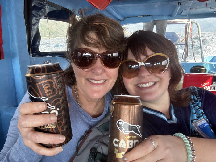 Two women wearing sunglasses pose for a photo indoors. The woman on the left has short brown hair and is holding a brown can of “Gallo Ultra” beer. The woman on the right has shoulder-length brown hair and is holding a similar brown can of "Cerveza Cabro" beer. The women are smiling while on a blue boat and there is water visible in the background.