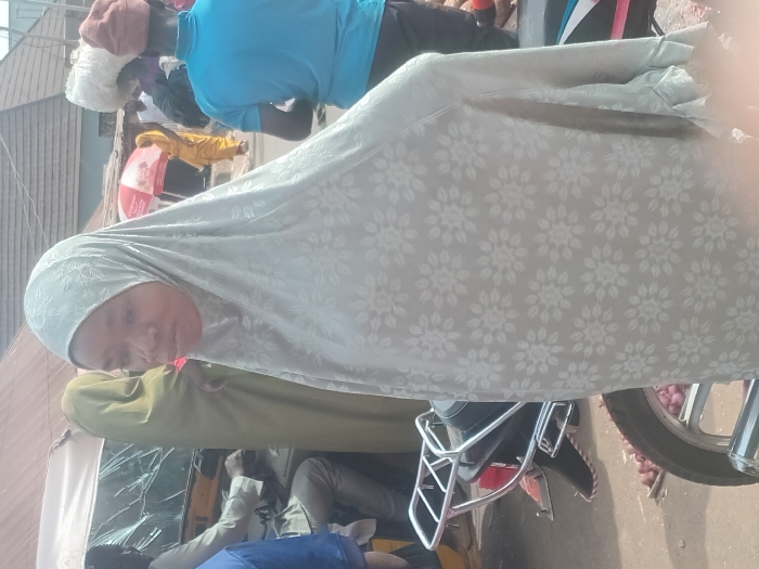 The image captures an outdoor street or market scene in Kawo, Nigeria. A young woman, the primary subject, stands slightly right of center in the foreground, facing towards the left side of the frame with a neutral expression. She wears a light grey or light green hijab and a matching full-length dress (abaya) featuring a repeating white floral pattern. Behind her, to the left, the rear section of a black motorcycle with a chrome luggage rack and a silver wheel is visible. Red onions are scattered on the ground near the motorcycle's rear tire. Further into the mid-ground, to the immediate left of the primary subject, a yellow auto-rickshaw (keke Napep) is partially visible, notably exhibiting a cracked or shattered windshield. A person in an olive green head covering and garment stands near this auto-rickshaw. In the background, to the right, a person wearing a blue t-shirt and a brown cap stands with their back to the viewer, carrying a large white bundled item on their head. Further down the street, a red and white market umbrella is visible, alongside other individuals, including one wearing a bright yellow garment. Building structures with brown roofs line the distant background, indicating an urban or semi-urban environment.