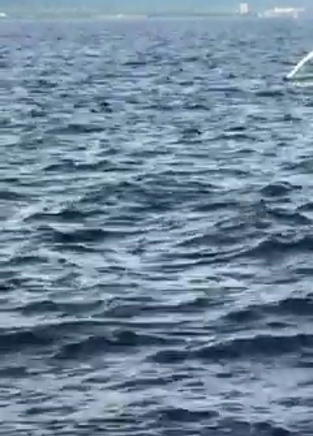body of water, a portion of which is in focus. The water is dark blue, rippled by waves. Initially, there is a white, sail-like object on the upper right. Shortly after, a pair of dolphins leap from the water and dive back in. In the background, there is land with some sort of industrial facility on it, including a tall red-and-white chimney. The sky is partly cloudy.