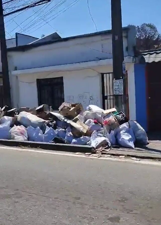 street scene in what appears to be an urban area, possibly a neighborhood in a city or town. Along the side of the road, there is a large pile of trash consisting of bags, boxes, and assorted items. The trash is located on the sidewalk next to a blue wall and a closed metal door. In the video, several individuals wearing what appears to be uniform or work attire, including white hard hats and tan suits, walk along the sidewalk. They each carry a blue bag or pack on their backs and are walking in the same direction. The group is walking in a coordinated manner. The background of the scene includes buildings, fences, and a hillside with dense housing. In the distance, there is a restaurant sign visible. The weather appears to be sunny and clear, with a bright blue sky. Power lines are visible overhead.