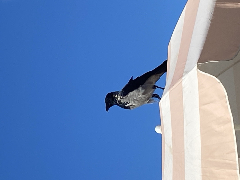- "A bicolored bird, identified as a hooded crow or similar species, stands centrally on the apex of an open beach umbrella against a clear, deep blue sky" by FM-L3ruv1, licensed under CC BY 4.0