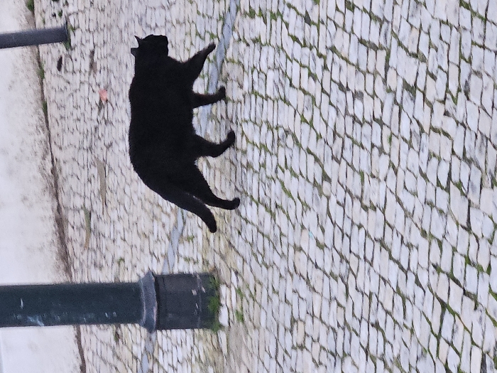 - "A black cat stretches out on a light cobblestone surface, with its body positioned between a gray post on the left and a wider expanse of cobblestones on the right" by FM-yfXT73, licensed under CC BY 4.0