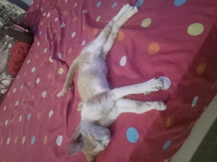 - "A small, light orange and white cat is depicted sleeping on its back, fully stretched out, on a reddish-pink bedspread patterned with multicolored polka dots (light blue, orange, white/light grey)" by FM-uD18w2, licensed under CC BY 4.0