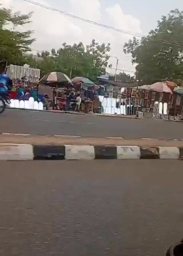 view from a moving vehicle of a street scene. Initially, a yellow truck passes by. Then, a motorcycle followed by a yellow three-wheeled vehicle, or "Keke Napep," move along the side of the road. The area adjacent to the road has various stalls and shops. People are visible walking along the roadside, some near parked vehicles. A Zenith Bank building can be seen in the background. The road is paved and marked with black and white curbs. There are utility poles and wires overhead.