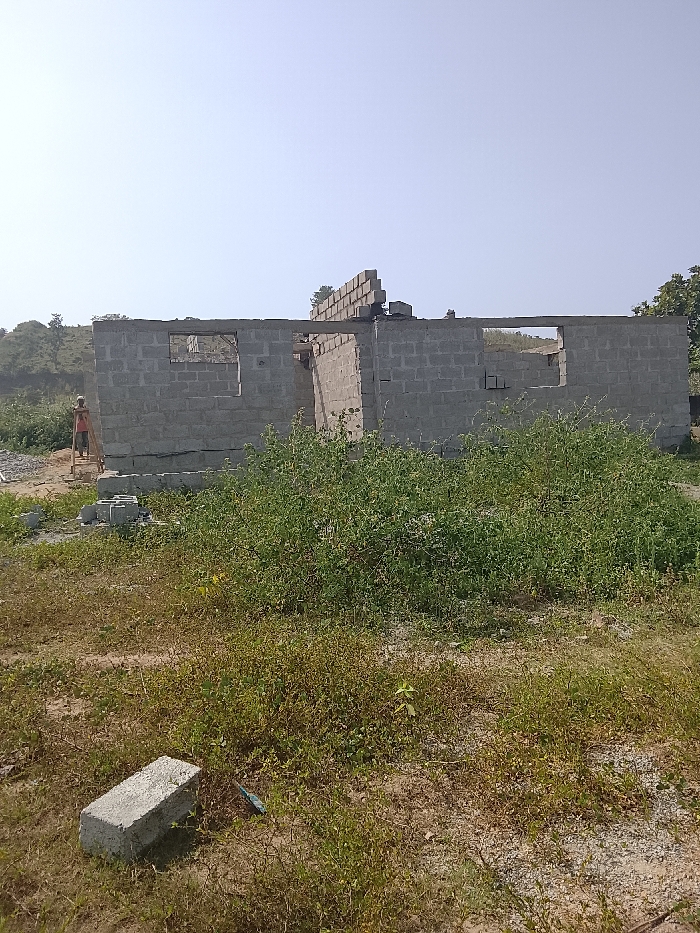 The image displays an outdoor construction site in Kurudu, Nigeria, under a clear, pale blue sky