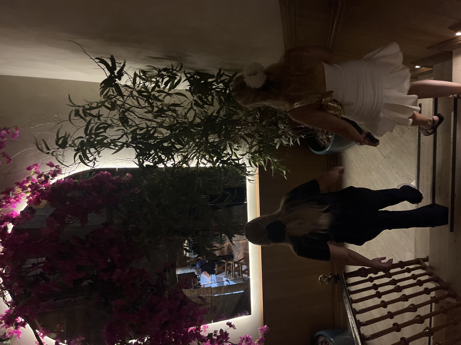 Two individuals, appearing to be adult females, are captured from behind as they descend a staircase in a dimly lit interior setting in Sevilla, Spain. The person on the left wears a black t-shirt, dark pants, and dark footwear; their blonde hair is pulled back by a dark scrunchie. Their left hand is positioned near a light-colored, ornate metal handrail that borders the left side of the staircase. The person on the right wears a white strapless mini-dress with a ruffled hem, dark sandals, and has a white floral clip in their blonde hair. This individual carries a light-colored shoulder bag and holds a mobile phone in their right hand. The staircase features light-colored steps. The background wall is light-colored, with architectural paneling visible on the right. A large arched mirror dominates the upper-left background, framed by illuminated pink bougainvillea-like flowers, which reflects a portion of an adjacent interior space with tables, chairs, and at least one seated person. To the right of the mirror, a tall potted plant with dark green, elongated leaves stands in a dark container. Another blue-green potted plant is partially visible on the floor to the far left, and a small golden figurine rests on a ledge nearby.