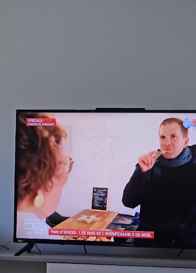 A television displays a scene from a show with the title "UN JOUR UN DOC de Noel" in the lower-left corner. The text beneath the image reads "PAIN D'EPICES: LES ROIS DE L'INDISPENSABLE DE NOEL." The screen shows a man in a black jacket and scarf sampling a piece of gingerbread in front of a woman wearing a white coat and large earrings. A table between them holds more gingerbread pieces. The background appears to be a small shop with other people visible. The television is sitting on a white stand with a woven chair visible in the foreground.