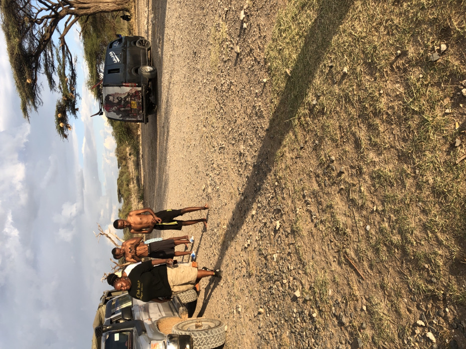 Four men stand on a gravel road near two parked vehicles, a white 4x4 and a black van adorned with graphics. The sky is cloudy, suggesting an overcast day. A tree with extensive branches is visible on the left, casting a shadow. The landscape includes sparse vegetation along the roadside. The men are dressed casually, some shirtless. The scene gives the impression of a roadside stop during a trip.