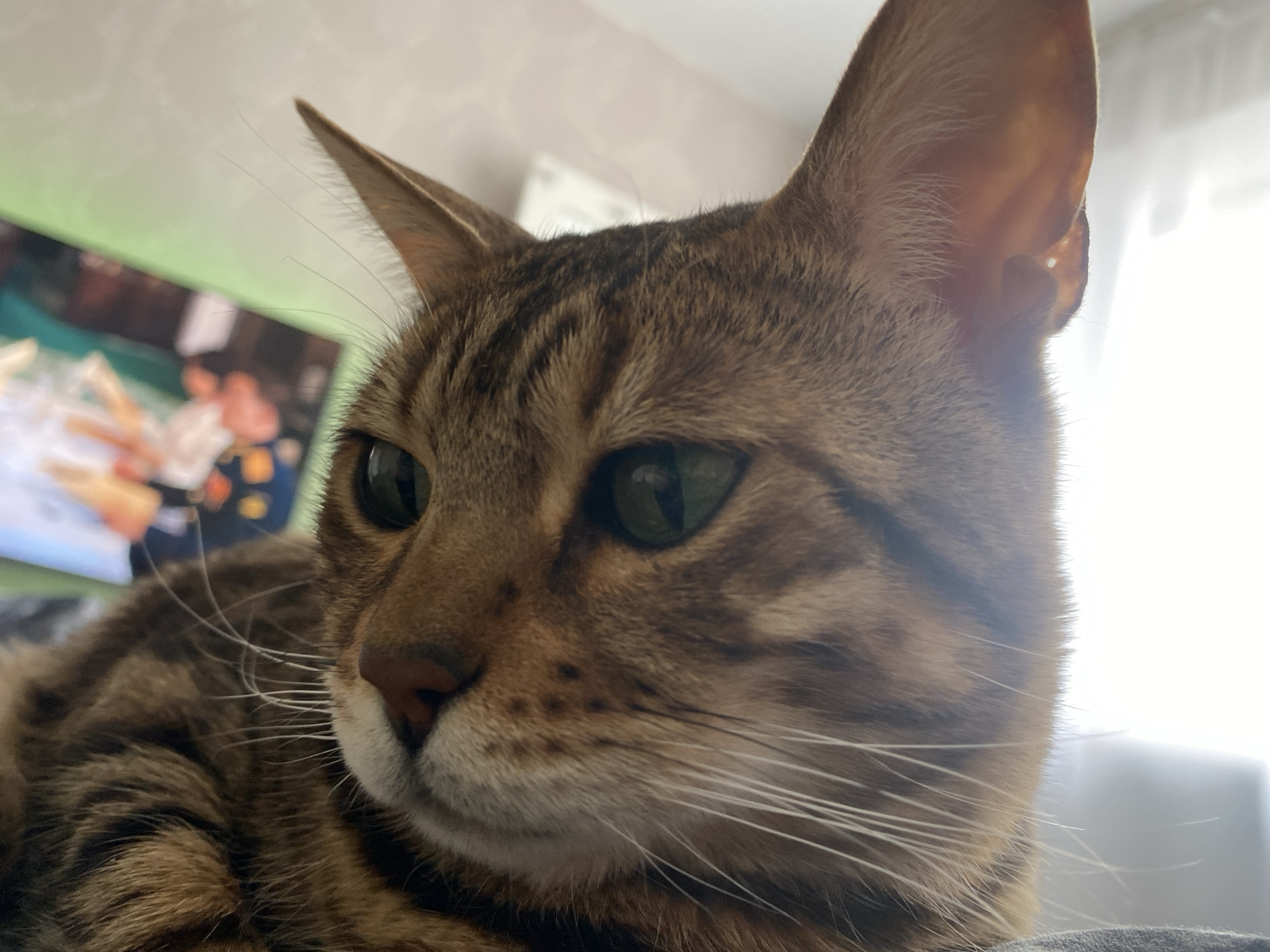A close-up, low-angle photograph taken indoors in Chaikovsky, Russia, features a domestic cat, likely a Bengal breed, with short, brown and black patterned fur and prominent green eyes. The cat's head occupies the majority of the frame, facing towards the left. White whiskers extend from its muzzle, which features a pinkish-brown nose. Its ears are erect and pointed. In the blurred background to the upper-left, a segment of a light green wall is visible above a television screen displaying indistinct, brightly lit content, possibly depicting human figures or objects in white and orange tones. The background to the right is overexposed and white, consistent with a window or brightly lit wall. The cat appears to be resting on a dark, indistinct surface in the foreground.