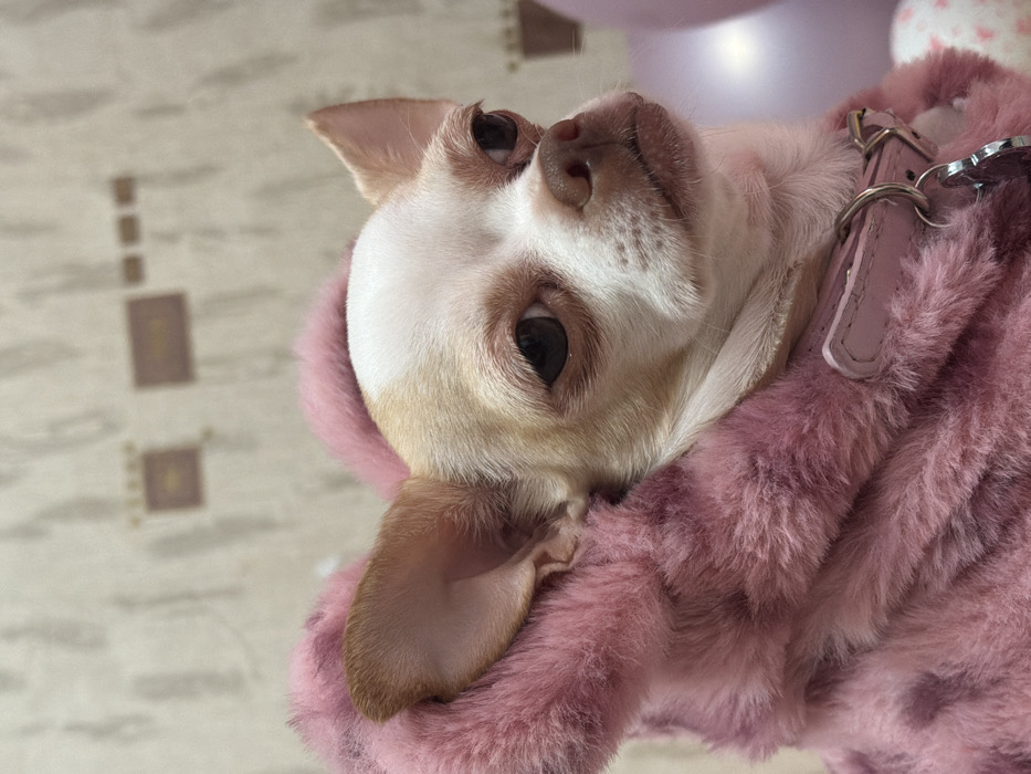 A chihuahua dog is centered in a close-up, indoor portrait within the city of Yambol, Bulgaria. The dog has a white face, chest, and forehead, with light tan fur around its eyes and ears. It wears a pink faux fur garment, appearing as a hooded coat, that covers its body and frames its head, with the hood pulled up around its ears. A light pink collar, featuring a silver-colored D-ring, a split ring, and two attached metal tags, is visible beneath the faux fur. The dog's dark eyes are directed slightly upward and to the right, away from the viewer. Its pointed ears are erect. The background consists of a light beige or off-white wall with subtle, darker, rectangular and linear patterns. In the lower right background, out of focus, a large, light pink spherical object, likely a balloon, is partially visible, along with a blurred white object speckled with pink. The lighting is soft and ambient.