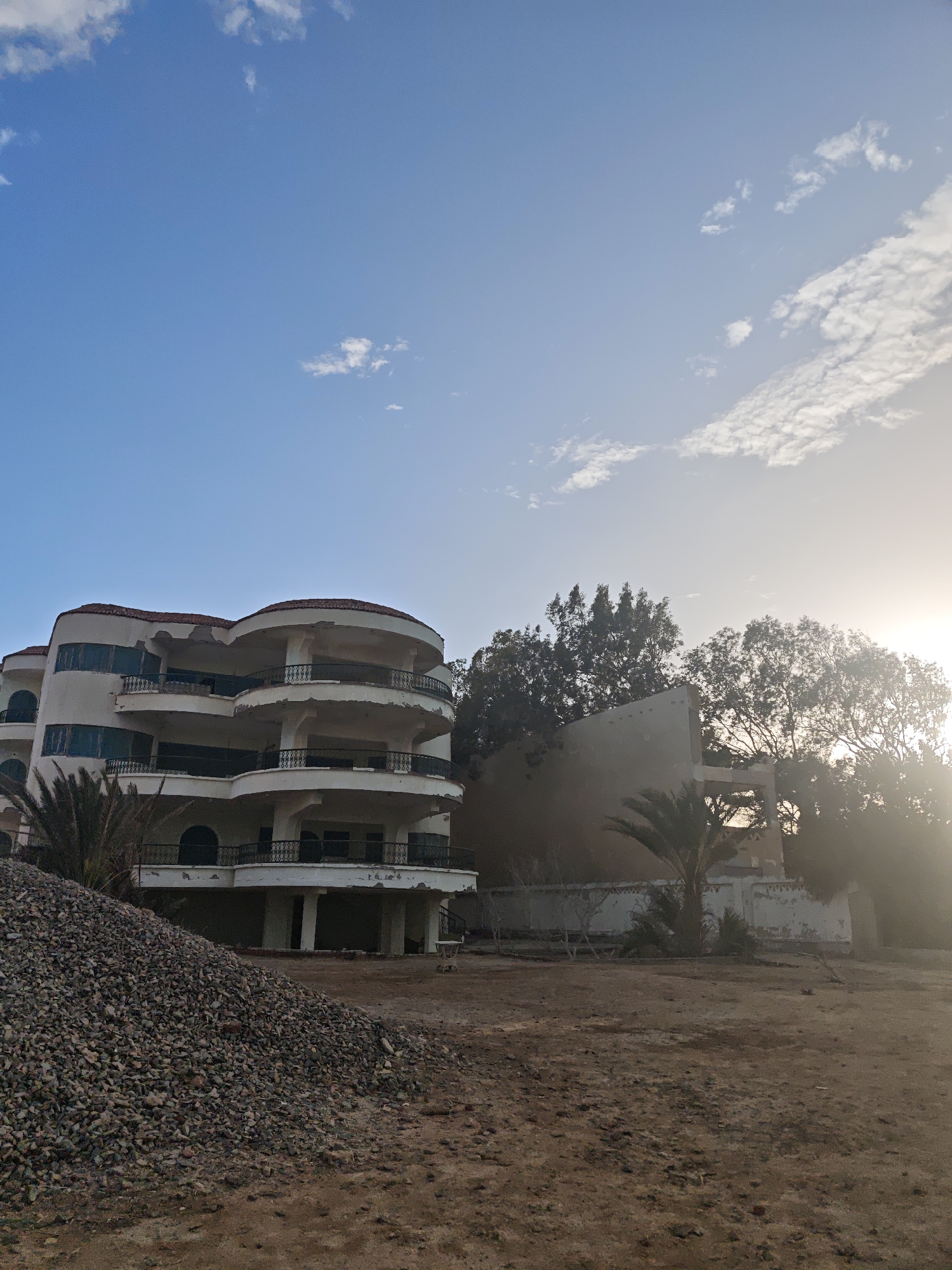 This image depicts an outdoor, undeveloped area in Al Ahia', Egypt, under a bright blue sky with scattered white cumulus clouds. A strong sun glare is visible in the upper right quadrant, indicating the sun's low position. The foreground consists of dry, reddish-brown earth, with a substantial pile of dark grey crushed aggregate situated prominently on the left. In the midground, a multi-story building, appearing unfinished or derelict, occupies the left half of the frame. This structure features an off-white exterior with multiple curved balconies across its levels, each equipped with dark metal railings. The building shows extensive peeling paint, exposed structural elements, and fragmented red roof tiles. Some windows are dark or fitted with blue shutters. A small palm tree is partially visible in front of the building on the left. To the right of the building, the ground transitions to more dry earth, leading towards a line of mature trees, predominantly dark green. These trees partially obscure a light-colored, damaged concrete wall or structure behind them. Another smaller palm tree is visible closer to the ground on the right. No human subjects or active subjects are present.