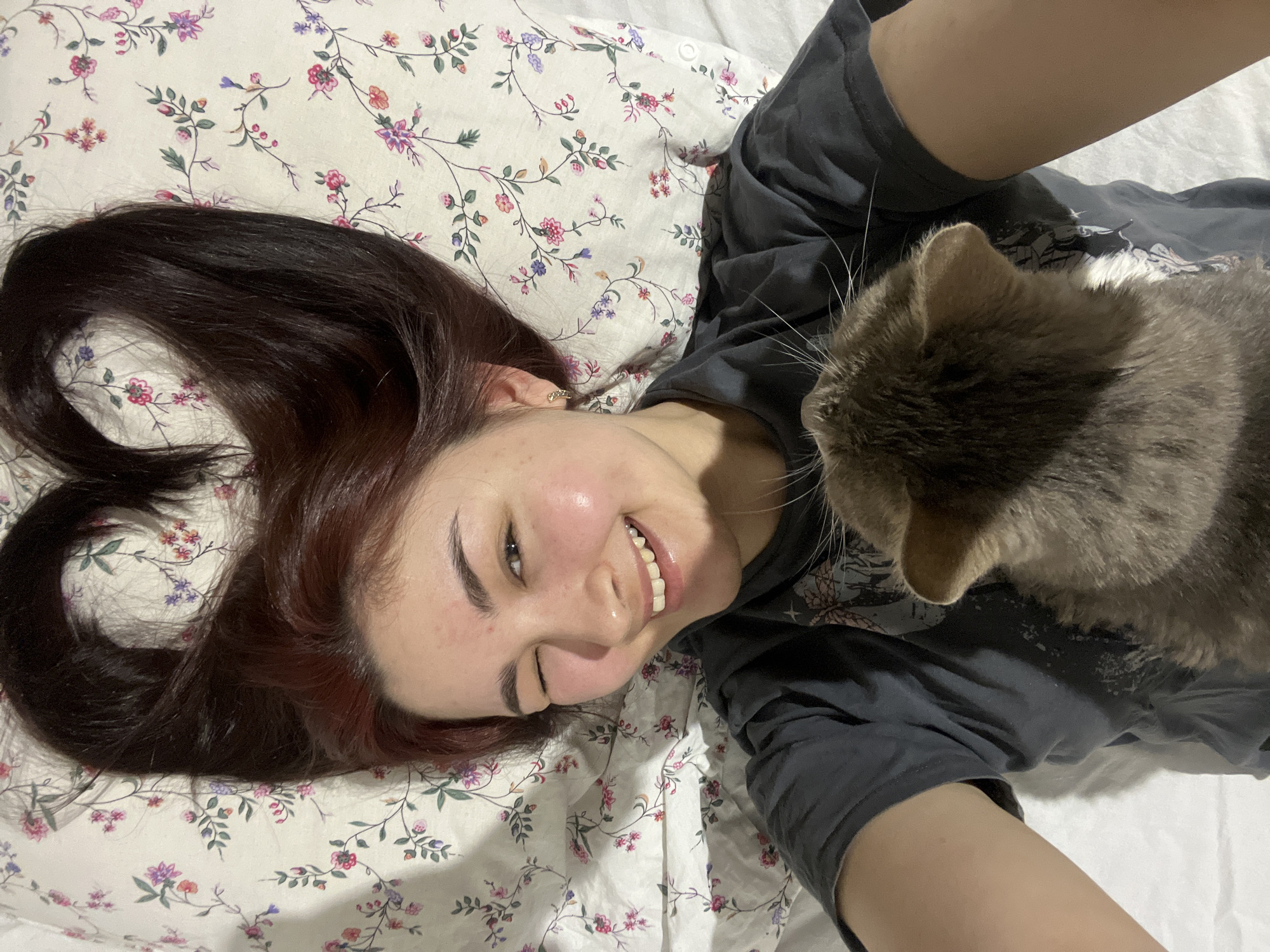 A young woman lies on a bed covered in a floral-patterned sheet. Her long, dark hair is spread out, partially forming a heart shape. She is smiling and winking at the camera. A grey tabby cat is close to her, nuzzling her shoulder. The woman wears a dark t-shirt. There is no visible information to determine that the location is in the city of Neftekamsk, Russia.
