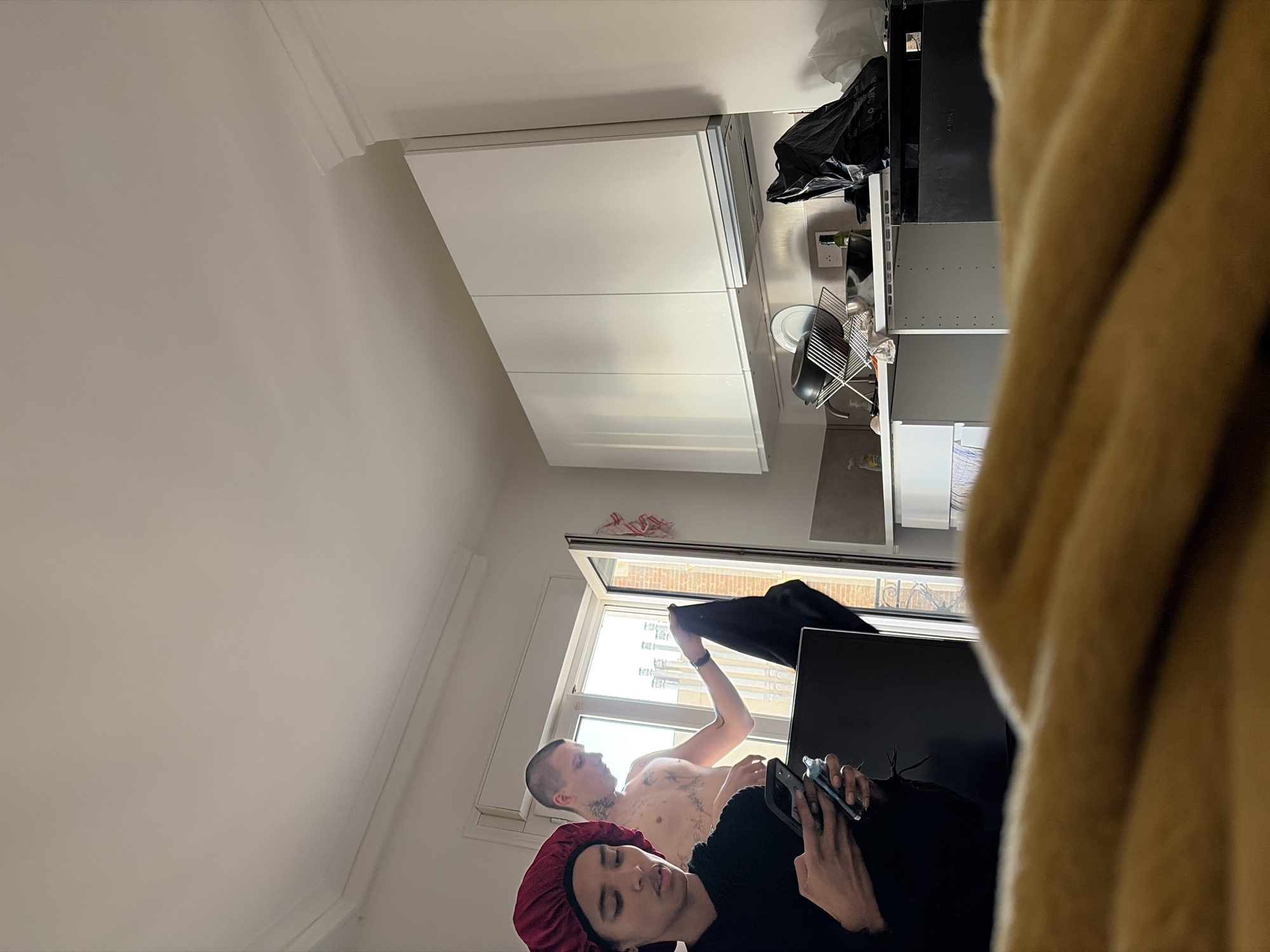 A sideways medium shot depicts two people inside an apartment in Paris, France. One person, wearing a maroon bonnet and black shirt, is lying down while holding a mobile device. Another person, with a shaved head and shirtless, is standing near an open window, holding up a dark garment. The apartment features white kitchen cabinets, a black television, and a tan bathrobe partially visible in the foreground. Outside the window are buildings typical of Paris.