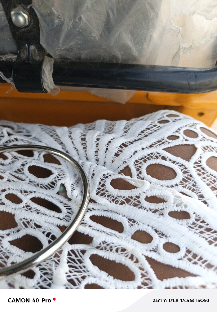 The image displays a close-up, downward-angled view of a person's leg or upper thigh in Lekki, Nigeria. The leg is covered by a white lace fabric featuring an intricate, openwork pattern of interconnected ovals, revealing dark brown skin underneath. A plain, silver-colored metallic bangle rests on the lace in the lower-left foreground. Directly above the leg, a black metal bar, appearing to be a structural component or handle, spans horizontally. Clear, crumpled plastic sheeting is secured around this bar, with a silver bolt and nut visible on the left side of the frame, fastening a black metal bracket. A bright yellow surface, consistent with the bodywork of a vehicle such as a tricycle (keke napep), is visible in the background, behind the black bar. The subject is stationary within what appears to be a vehicle interior.
