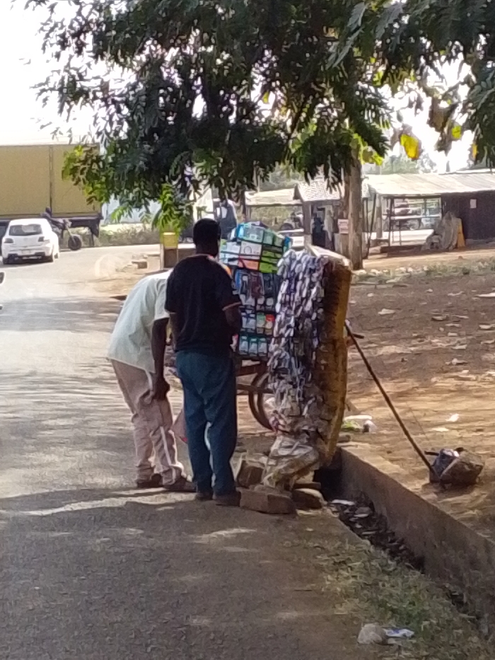 This image captures a street scene in Tamale, Ghana, under bright daylight. In the foreground, two adult males are positioned next to a two-wheeled mobile vending cart. The man on the left wears a light-colored short-sleeved shirt and light trousers, bending forward with his back partially to the viewer, seemingly attending to something near the ground. The man on the right wears a dark short-sleeved shirt and dark trousers, standing upright with his back to the viewer, positioned directly beside the vending cart. The vending cart is laden with various packaged goods, including colorful boxes and smaller items displayed on top, and what appears to be merchandise or protective wrapping covering its side. The cart is resting on the dirt shoulder, with a brick visible stabilizing one of its wheels. To the left of the men, an asphalt road extends into the mid-ground, showing shadows from overhead foliage. A white sedan is visible on the road in the mid-distance, followed by a large yellow truck and a partial view of a motorcycle. The right side of the image features a dirt shoulder bordered by a concrete drainage ditch. Beyond the ditch and further into the background, several simple, open-sided structures with corrugated roofing are visible, suggesting market stalls or small shops. A prominent tree with green foliage casts shadows and dominates the upper portion of the frame, indicating an outdoor, sunny environment. Scattered debris is visible on the ground and within the ditch.