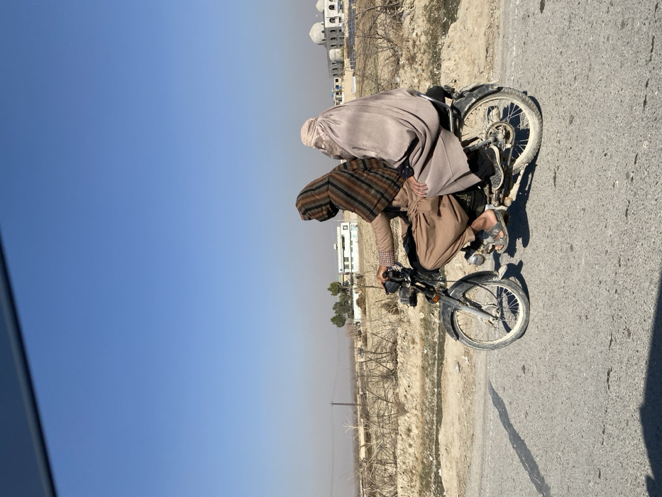 Two people ride on a motorcycle on a paved road in a dry, dusty environment. The person in front drives; both wear loose, traditional clothing. The back passenger is fully veiled. Buildings are visible in the background and telephone poles in the far distance. The sky is a pale blue. The motorcycle is an older model.
