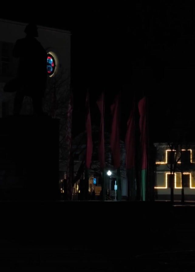 A static, low-angle, night-time shot shows a silhouette of a statue on a pedestal to the left, against the backdrop of a building with a round stained-glass window. In the middle are five Belarusian flags, their red and green colors faintly illuminated. To the right, a building is decorated with glowing, linear light displays arranged in geometric shapes, resembling crosses or stacked squares. A lamppost can be seen in the background. The overall scene has a dark, muted ambiance with limited light sources.