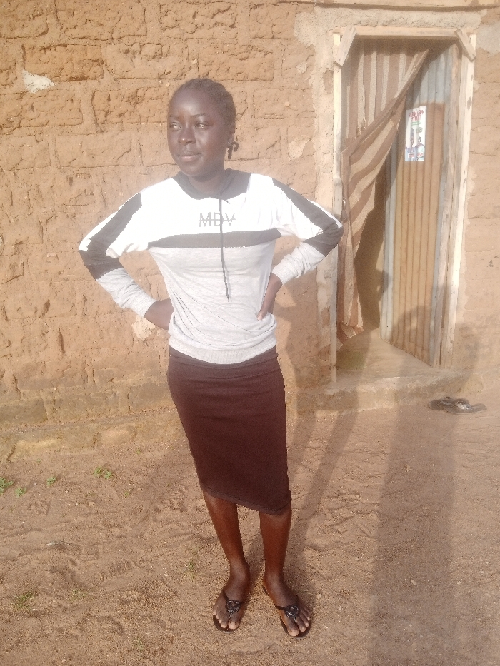 A young woman stands outside a building with a mud wall and corrugated metal door. She wears a grey long-sleeved shirt with black shoulder stripes, a dark brown knee-length skirt, and flip-flops. Her hands are on her hips. The ground is a sandy color. A partially draped piece of fabric hangs inside the doorway.