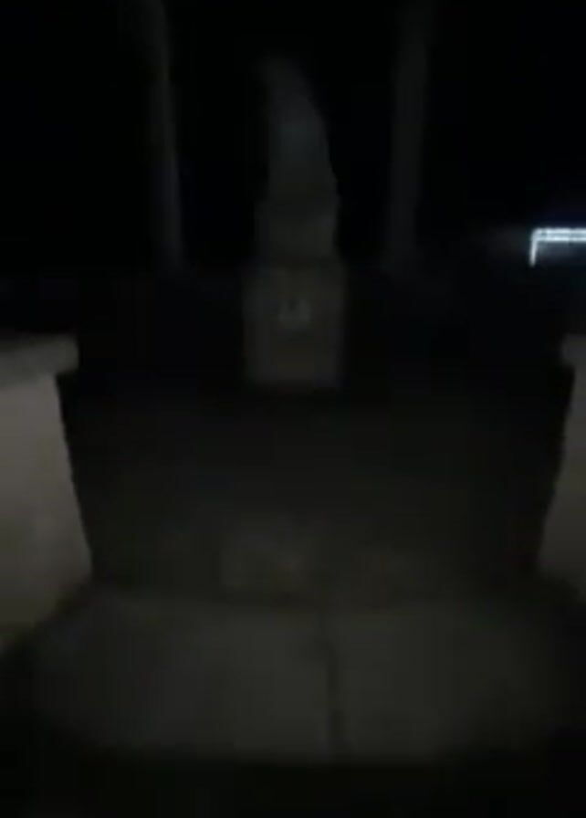 dark outdoor space, possibly a park or garden at night. The camera moves along a stone pathway leading up to a circular structure supported by columns. Inside the structure, centered in the frame, is a statue of a bird, possibly an eagle, perched on a pedestal. The pedestal appears to be defaced with graffiti. The overall lighting is low, giving the scene a shadowy and mysterious atmosphere.