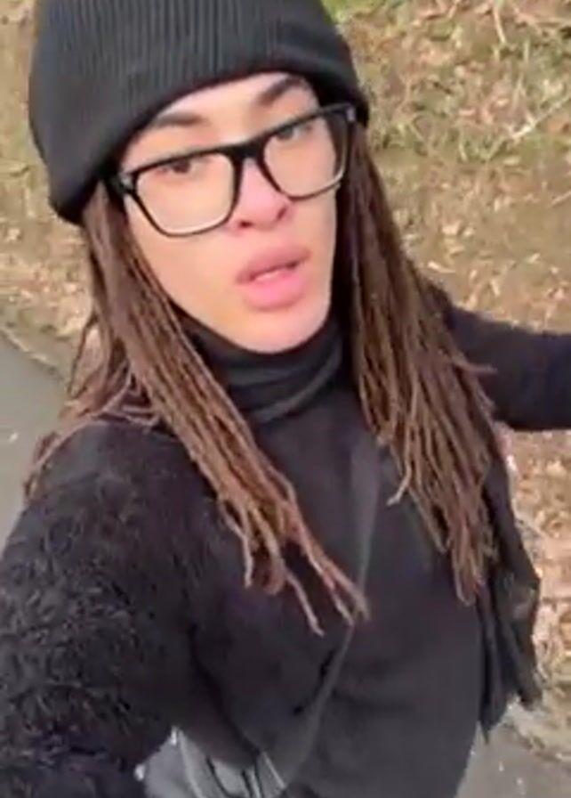 A person with brown dreadlocks, a black beanie, black glasses, and a black outfit walks along a gray path with brown leaves on the ground