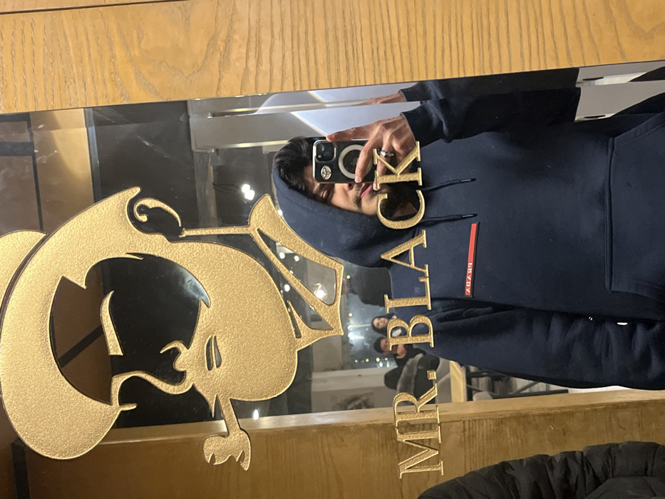 A person wearing a black hoodie is taking a selfie in front of a mirrored sign with golden lettering that reads "MR