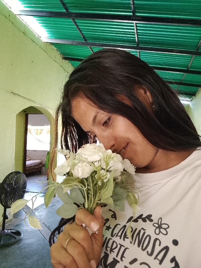 A woman with long, dark hair holds a bouquet of white roses close to her face, appearing to smell them. She wears a white t-shirt with black lettering. The background features a light green painted wall and a green corrugated metal ceiling. An open doorway reveals a glimpse of a room with a bed. A black fan stands on the floor in the foreground. The overall scene conveys a sense of serenity and appreciation for simple beauty.