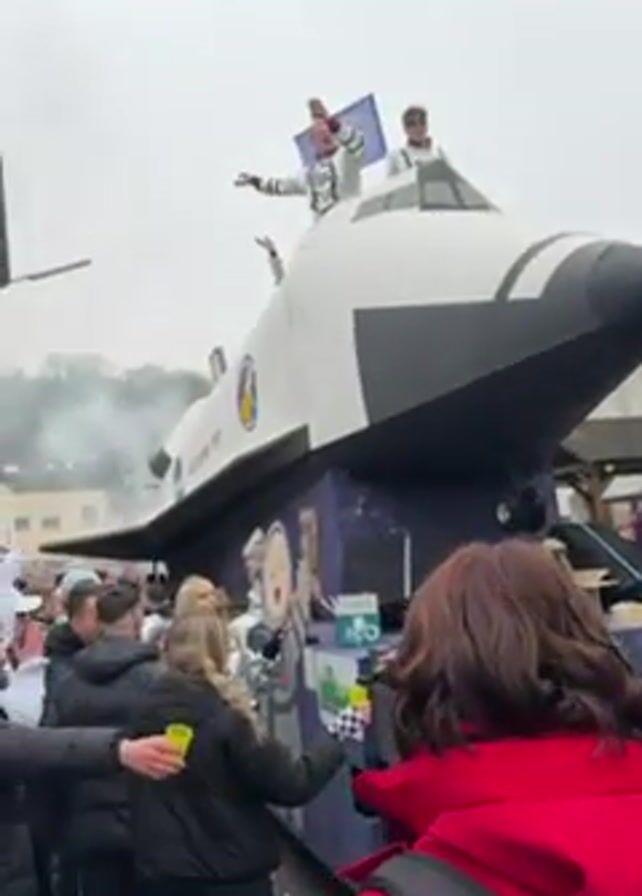 festive event with a large crowd gathered around a parade float. The float is shaped like a space shuttle, colored white with black accents. There are two people dressed in white astronaut suits standing on top of the shuttle, waving to the crowd and holding a small flag. The side of the float has colorful drawings and writing on it. People are standing around the float, many holding drinks. Some people reach out towards the float as it passes. The crowd appears to be having a good time, with a lively and cheerful atmosphere. The surroundings include buildings and street lamps, suggesting an urban setting. The sky is overcast, indicating a cloudy day. The video appears to have been taken by someone within the crowd, following the float as it moves.