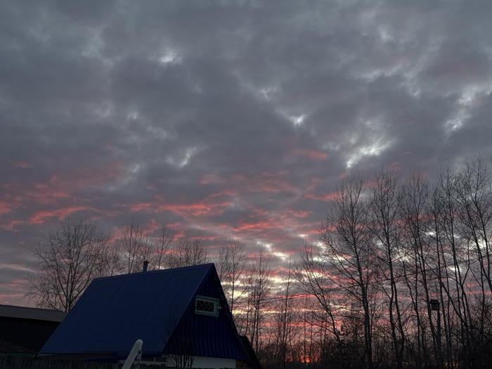 This image depicts a scene in Chaikovsky, Russia, at either dawn or dusk. The sky dominates the upper portion of the frame, characterized by dense, dark gray stratocumulus clouds. Below these darker clouds, a horizontal band of clouds displays vibrant pink and red hues, interspersed with streaks of bright white light, particularly towards the horizon on the right. In the foreground, slightly left of center, stands a single-story A-frame style house. It features a prominent dark blue corrugated metal roof, a visible chimney pipe, and a small rectangular attic window with a light green frame. The lower walls of the house appear to be a light, possibly white or pale, color. To the immediate left of this house, a portion of another dark-colored structure is visible. A light-colored fence or railing is present in the extreme bottom-left foreground. Numerous bare deciduous trees, silhouetted against the illuminated sky, occupy the middle ground, extending across the right half of the image and behind the house. Among these trees on the right, a slender pole with a small, dark, box-like object (possibly a birdhouse or a utility box) attached to its top is discernible. No individuals are visible in the scene. The overall environment suggests a semi-rural or residential area during a cold season due to the leafless trees.
