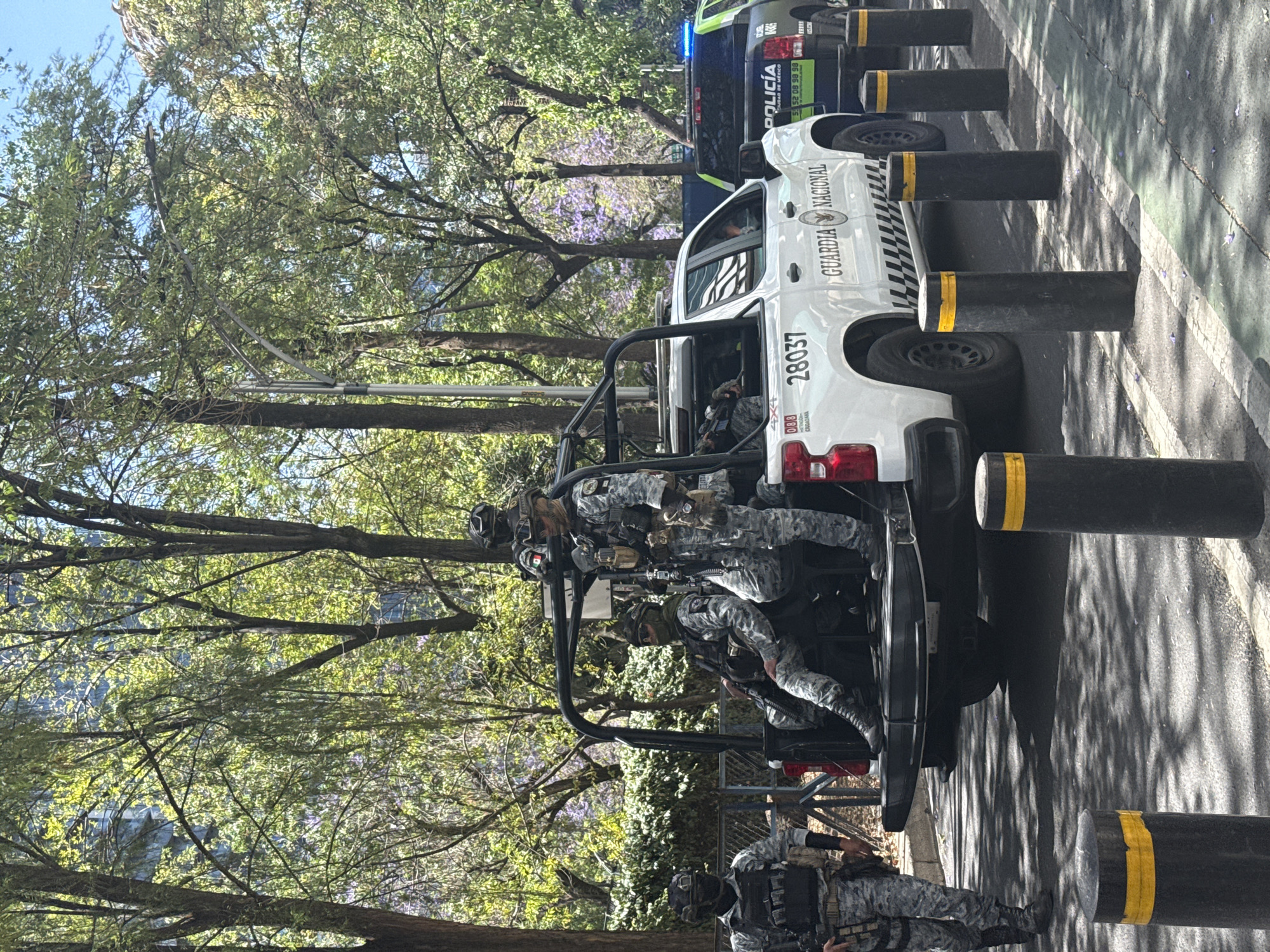 The image depicts a street scene in Mexico City, Mexico. Parked along a sidewalk with black bollards with yellow stripes are two vehicles: a white pickup truck with "Guardia Nacional" printed on its side and the number "28037," and a black and green police vehicle partially visible behind it. Several soldiers in camouflage uniforms and tactical gear are visible: some standing outside the truck and others riding in the back. The scene is under trees with green and purple foliage, and the street is in sunlight.