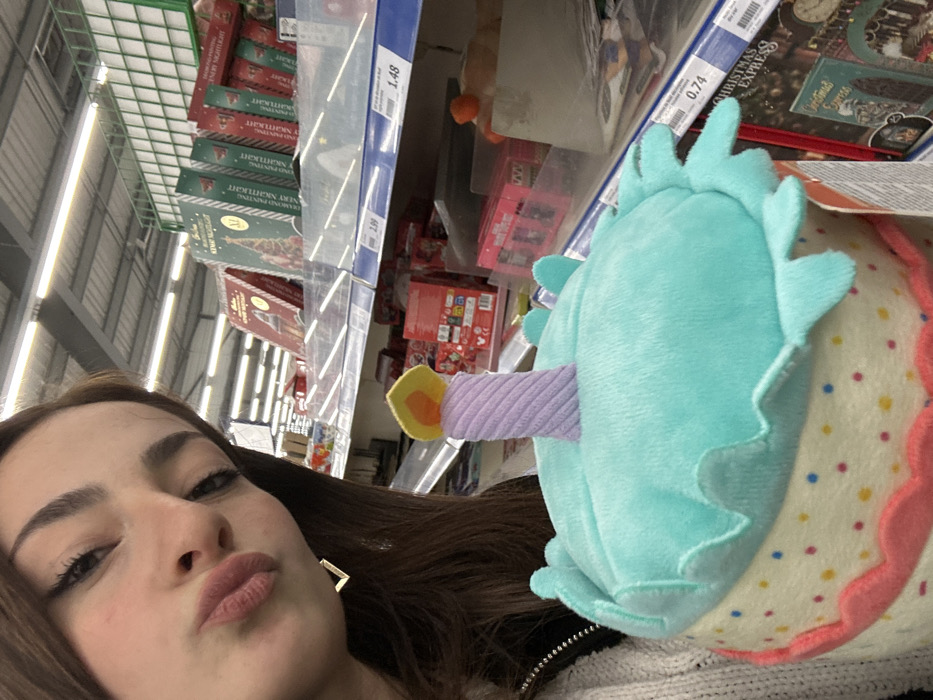 A young woman takes a selfie in a store aisle. She's making a kissy face, and a plush toy shaped like a birthday cake with a turquoise frosting and a candle is positioned prominently. Shelves of various products are visible in the background, including "Diamond Painting NERY NIGHTLIGHT" boxes, "Christmas Express" items, and price tags displaying "2.99" and "1.48".