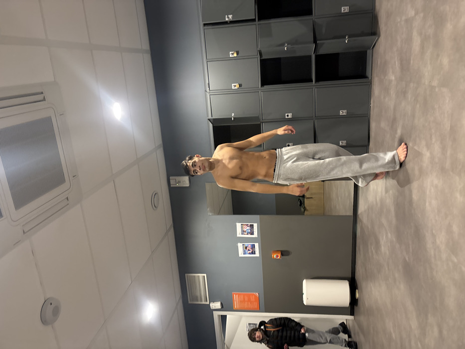 In a gym locker room, a shirtless man wearing grey sweatpants stands near grey lockers
