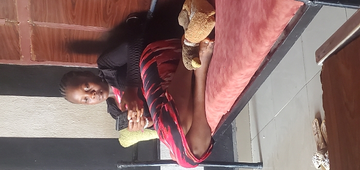 An individual, identified as a young adult female with dark skin and braided hair, is depicted seated indoors, looking down at a dark-colored smartphone held in both hands. She is wearing a black long-sleeved top or jacket over a red and black patterned dress, with a white beaded bracelet on her right wrist. Her legs are crossed at the ankles. She is positioned on a narrow black metal frame, resembling a bed or bench, which is topped with a reddish-orange cushion. A small, light green textured cushion is placed behind her upper left back. Near her bare feet on the cushion, a pair of light brown, open-toed footwear with a textured, possibly plush, surface is visible. Another pair of light-colored sandals or slippers rests on the tiled floor in the lower-left foreground. The background consists of a wall with distinct vertical black and light-colored stripes on the left, and a partially visible wooden door or panel on the right, featuring a horizontal seam and some surface wear. A prominent shadow is cast on the wooden panel. The scene appears to be an interior space, likely domestic, with lighting suggesting a source from the left. While contextually stated to be in Jos, Nigeria, no specific visual information within the image itself definitively confirms this precise geographic location.