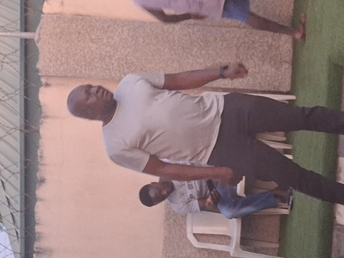 This image depicts an outdoor area in Barden Yana, Nigeria, featuring three males. In the foreground, a bald, dark-skinned male stands slightly to the right of center, oriented partially right. He wears a light-colored short-sleeved t-shirt, dark trousers, and a dark wristband on his left wrist. His left hand is clenched. Behind him to the left, a second dark-skinned male is seated on a white plastic chair, focused on a black smartphone held in both hands. This individual wears a light grey t-shirt, blue jeans, and dark flip-flops. The lower body of a third individual, wearing blue shorts and light-colored flip-flops, is partially visible on the far right, moving out of frame. The ground is covered with green artificial turf. The background consists of a light-colored wall, topped with barbed wire fencing. Two vertical structural elements, one smooth and one textured, are visible against the wall.
